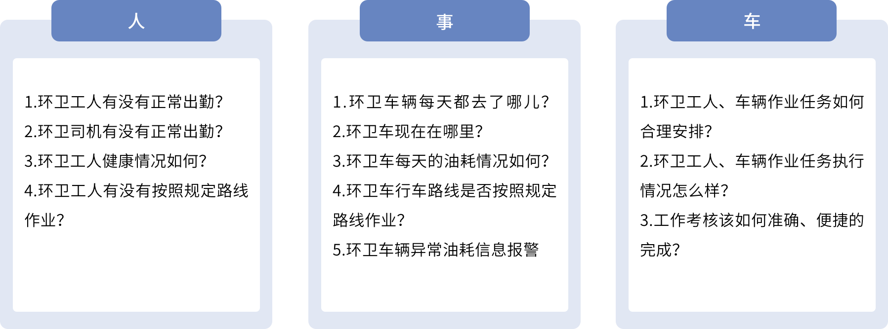利用物联网、GIS和GPS/北斗等技术,对环卫管理所涉及到的人、车、事进行全过程实时管理, 实现环卫工人、环卫车辆与平台的实时交互,提升环卫作业质量,降低环卫运营成本;对城市环卫设计规划及环卫管理模式的合理性进行数字化的评估。
