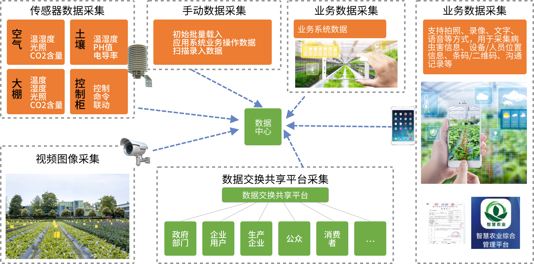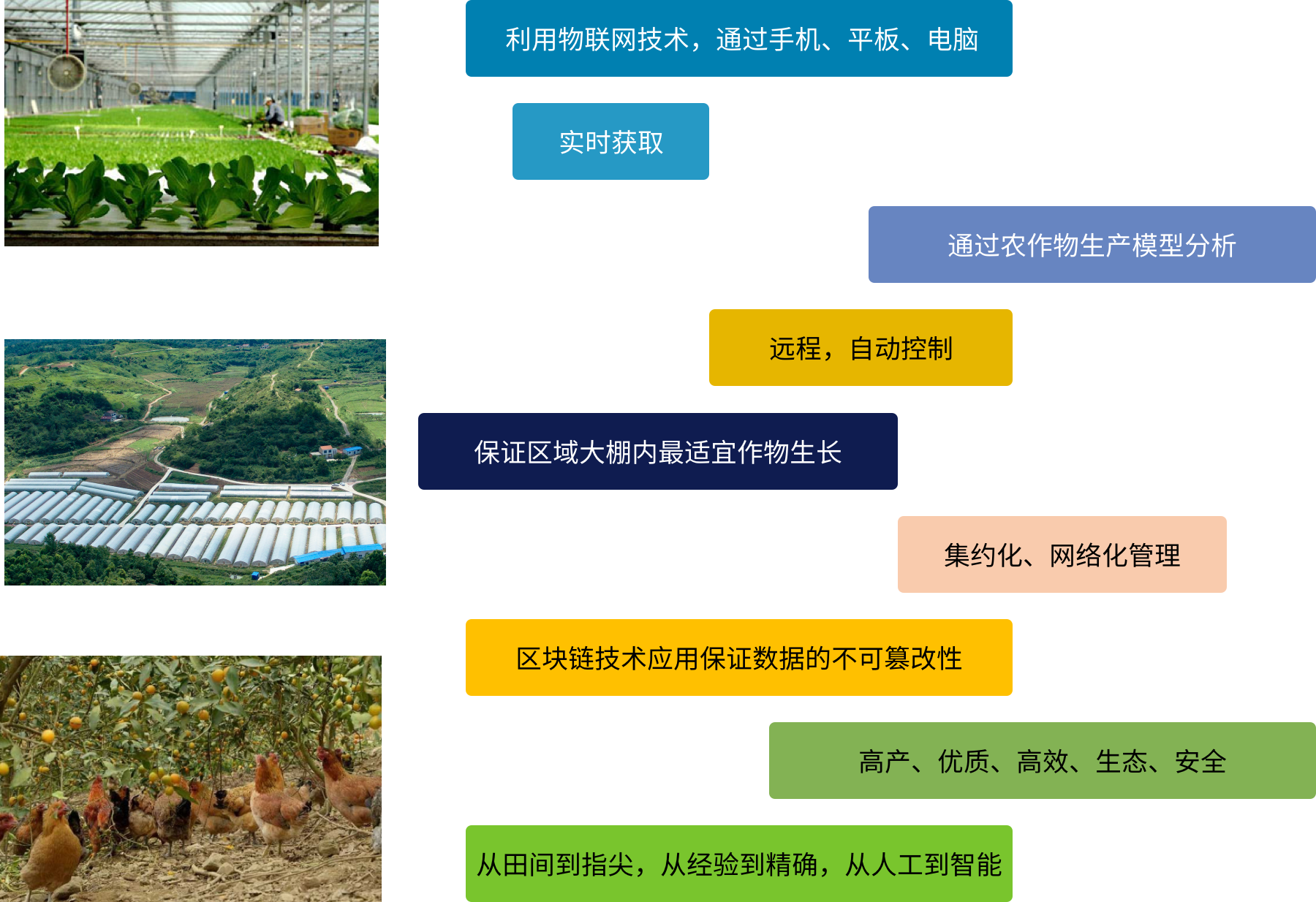 智慧农业系统平台以生态家禽(土鸡养殖)、食用菌、辣椒种植、畜禽养殖为应用支撑, 依托物联网和区块链手段,为农产品生产流程管控信息,提供标准化、智能化的辅助决策,提高生产效率,提升农业生产智能决策能力。
