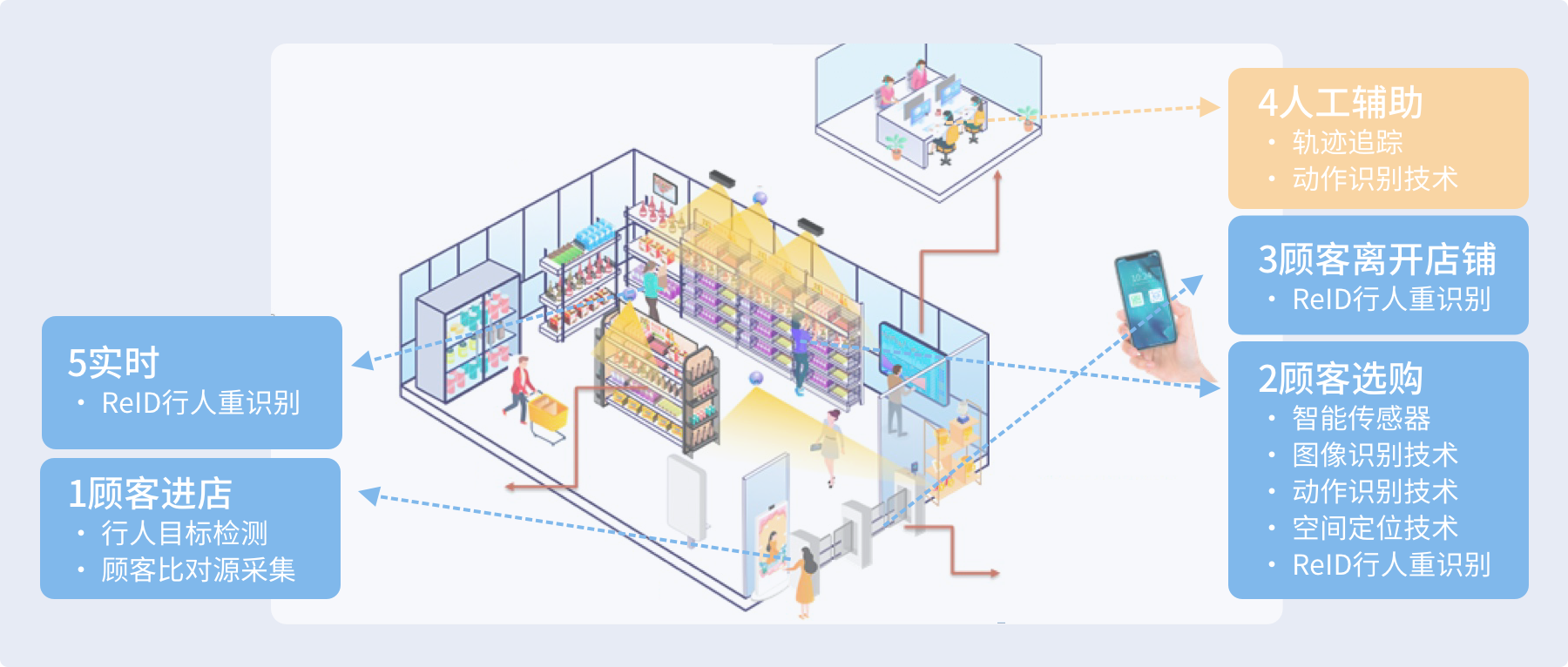 重新定义人们的购物方式,将传统商店升级为高度数字化、智能化、无需人工收银的智慧商店。包括图像识别部分和IoT货架传感器技术,后台结算,货架管理,大屏展示等。