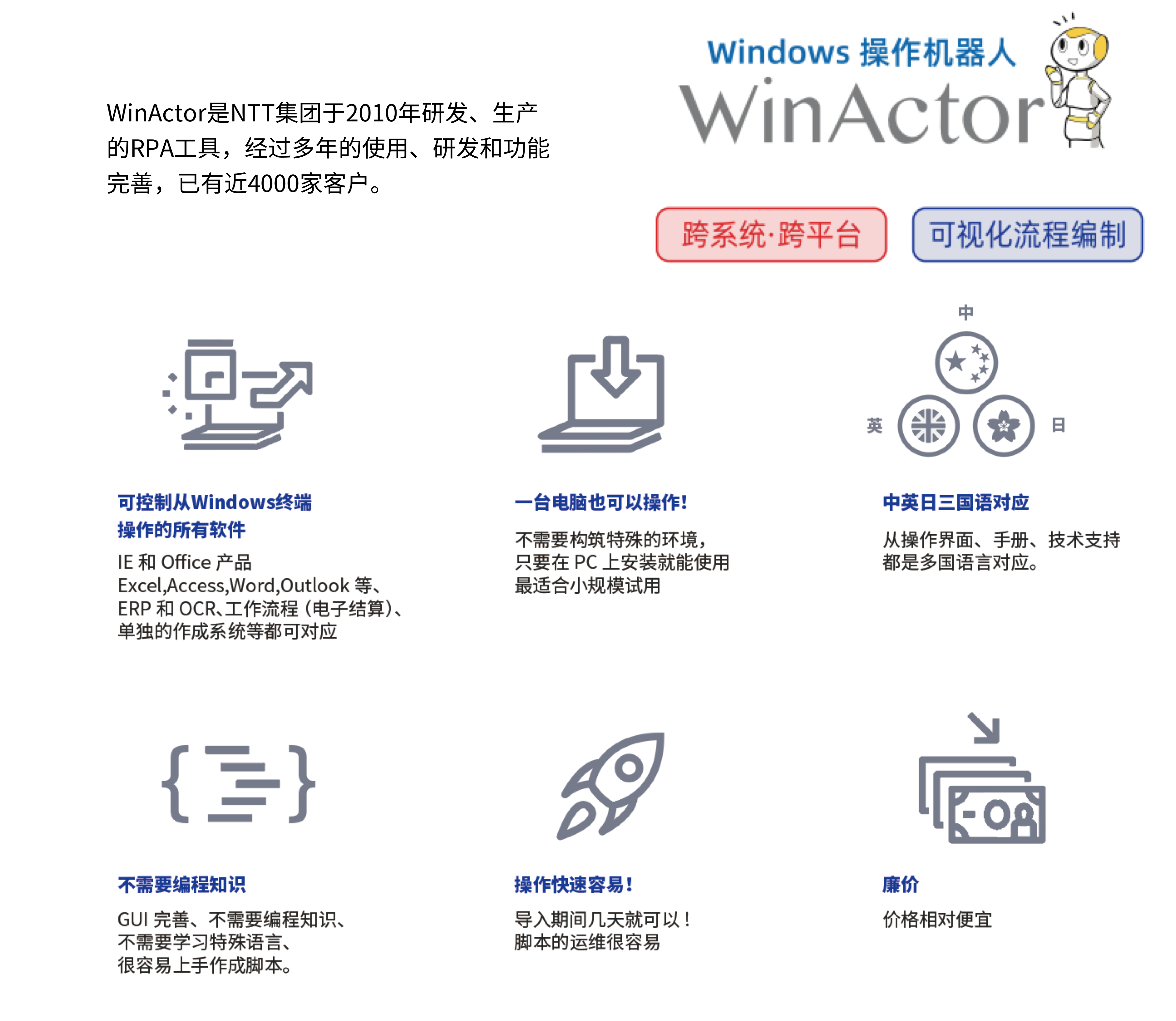 解决方案 金融·保险 RPA产品 RPA产品-WinActor NDIT提供从RPA的导入咨询到动作脚本作成,导入后的维护、运用支持,及外包服务的全套服务。 我们致力于为客户提供更加自动化和效率化的RPA产品。 联系我们 NDIT的RPA解决方案提供了一整套的服务 RPA 将员工从机械作业中解放出来 产品介绍 案例介绍