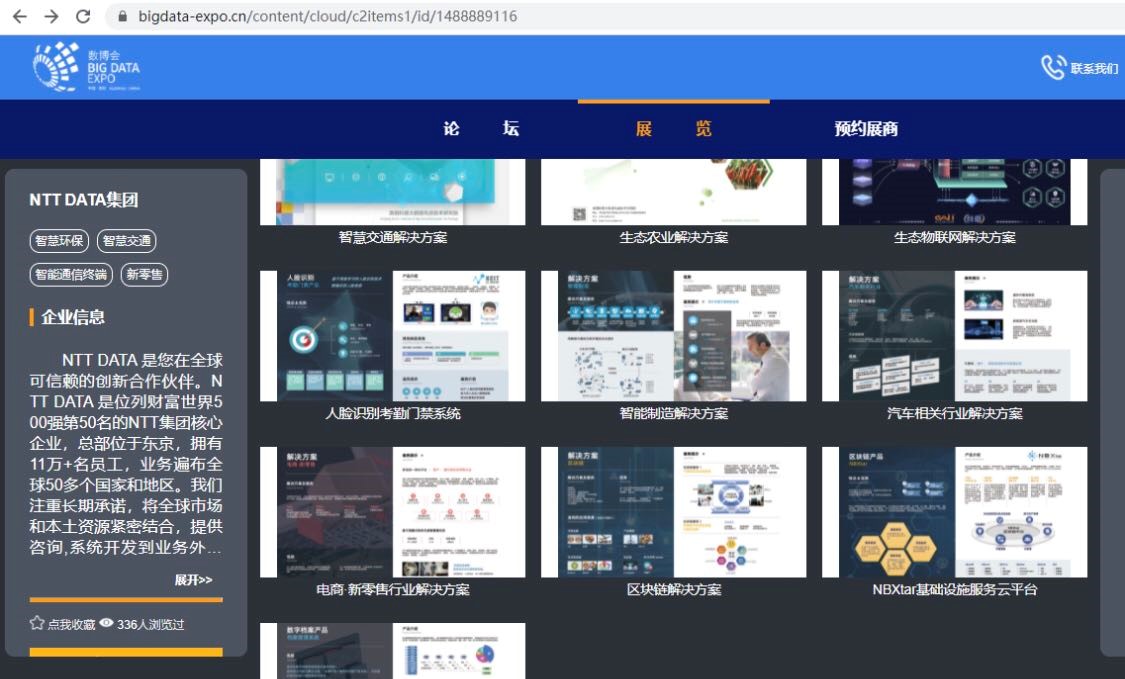 依托于专业完备的研发技术,NTT DATA在本届数博会为期半年(2021年5月23日-12月31日)的 “线上展会”中, 展出了“NBXtar基础设施服务云平台”、“区块链解决方案”、“智能制造解决方案”、“电商·新零售行业解决方案”、“汽车相关行业解决方案”、 “人脸识别考勤门禁系统”和“数字档案管理系统”等7项科技成果。
