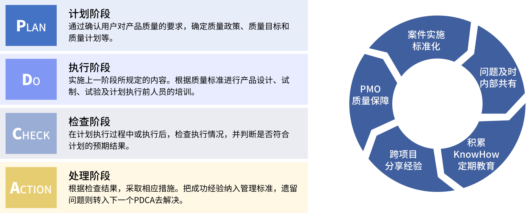 拥有专业的质量管理团队,在项目实施过程中,持续改进管理流程,以降低风险、 提高开发管理能力、满足客户需求、确保项目品质为目标,为最终顺利交付提供了强有力的保障。