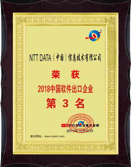 大会期间公布了2018中国软件出口和服务外包(ITO)十强企业名单,NTT DATA(中国)信息技术有限公司(简称:NCIT)荣获2018中国软件出口企业第三名, 公司董事长总裁高永东先生获得中国软件出口和服务外包卓越贡献奖。