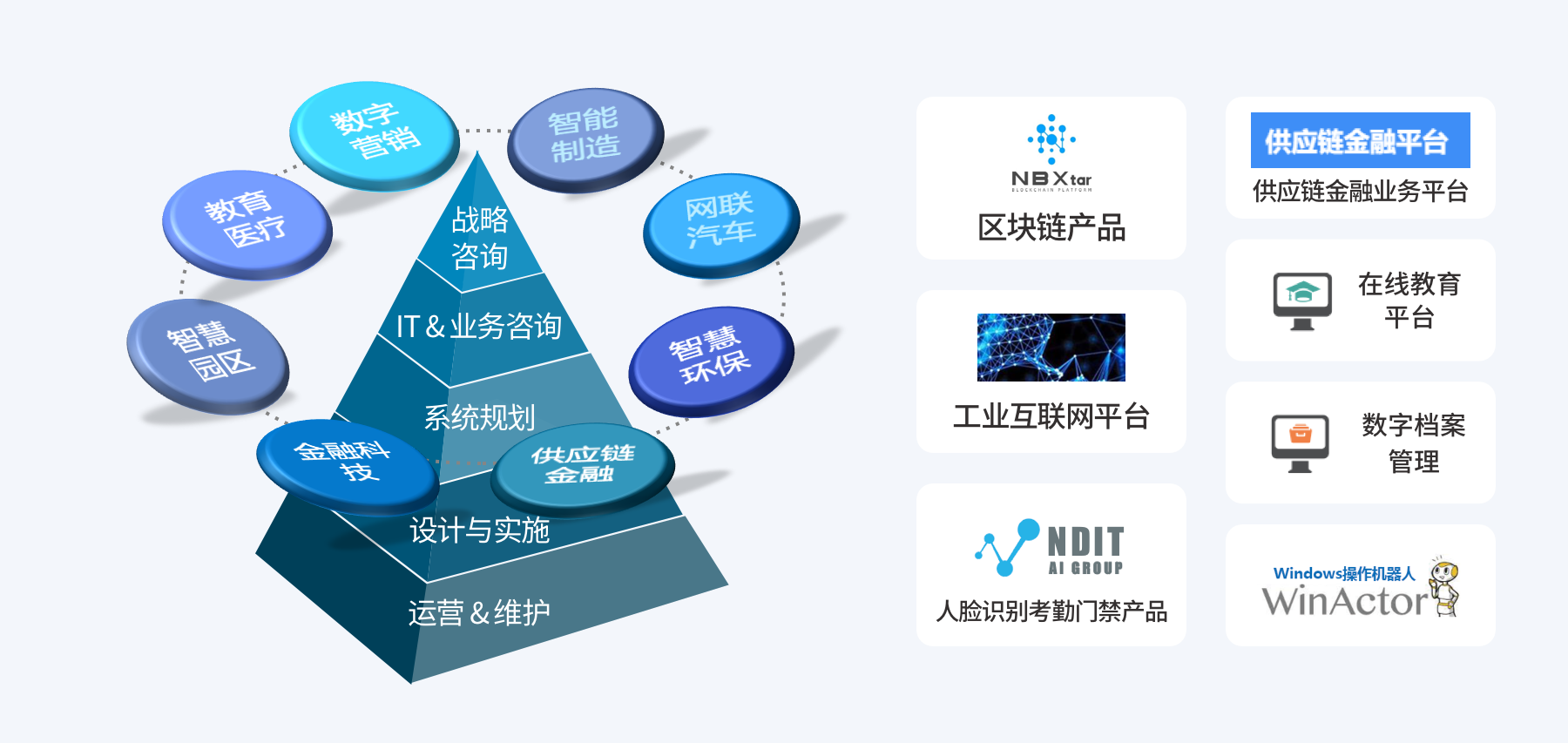 NDIT以创新成熟的IT解决方案为基础,以全球化的视野和规模,帮助客户实现梦想。 在北京、上海、无锡、天津、杭州、西安设有交付中心,服务遍及全国各地。 我们提供各行业IT解决方案,尤其在智慧园区、智慧环保、供应链金融、数字营销、智能制造、网联汽车、金融科技、教育医疗等行业有成熟解决方案, 通过咨询、行业解决方案、业务流程服务、数字化和 IT 现代化以及托管服务,力求成为帮助客户实现变革的全球合作伙伴。