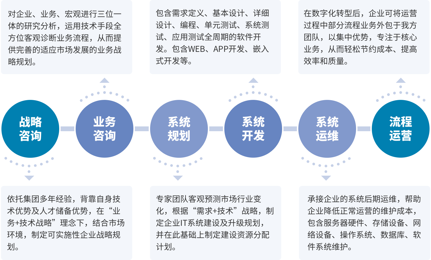 我们致力于为客户企业提供一站式、全流程数字化IT解决方案,为企业提供可定制的专属IT服务, 提供战略咨询、业务咨询、系统规划、系统开发、系统运维和流程运营的专业IT服务。